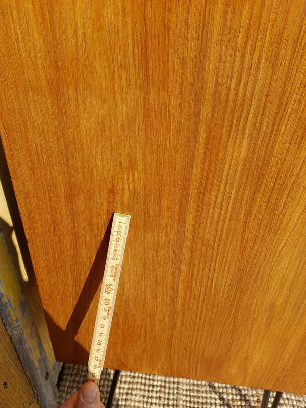 Eine Stelle mit minimalem Furnierschaden der nicht sichtbar ist siehe Foto mit dem Zollstock
